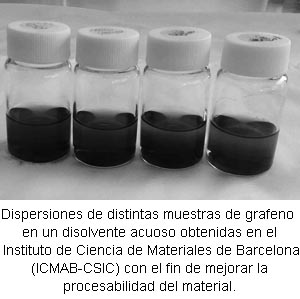 Por un lado estamos utilizando el grafeno como material de relleno (“filler”) en la preparación de materiales compuestos con el fin de mejorar las propiedades mecánicas y eléctricas del material de matriz. Para obtener una buena dispersión del grafeno con el material de matriz es necesario modificar químicamente el grafeno para facilitar su procesabilidad e integración en el material compuesto. En el ICMAB desarrollamos distintos protocolos para dispersar el grafeno en una variedad de disolventes tanto de base acuosa como orgánica.
