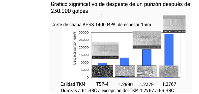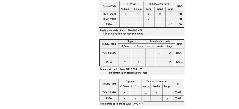La calidad de acero TKM 1.2379, es la más empleada y universal para el conformado, corte y embutición en frio (acero LEDEBURITICO con un 12% de Cromo), pero esta calidad no siempre es la más adecuada para las exigentes aplicaciones en el procesado de chapas de alto limite elástico, tipo AHSS, ya que no presentan/aportan la suficiente resistencia a las roturas/melladuras en servicio, es por ello que hay que tener en cuenta las siguientes consideraciones generales: